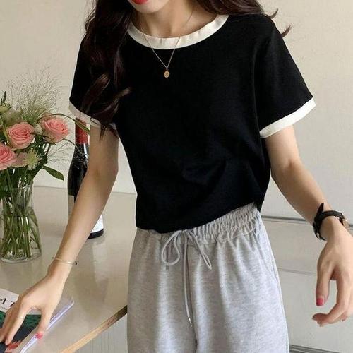 [셀러허브_여성트랜드패션]ONM 힙감성 데일리 여자 투톤 배색 크롭 반팔티셔츠