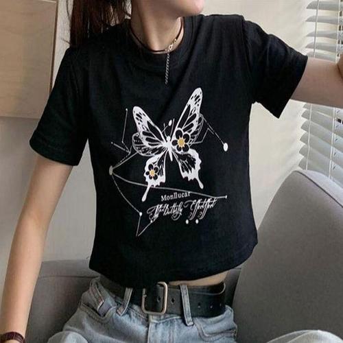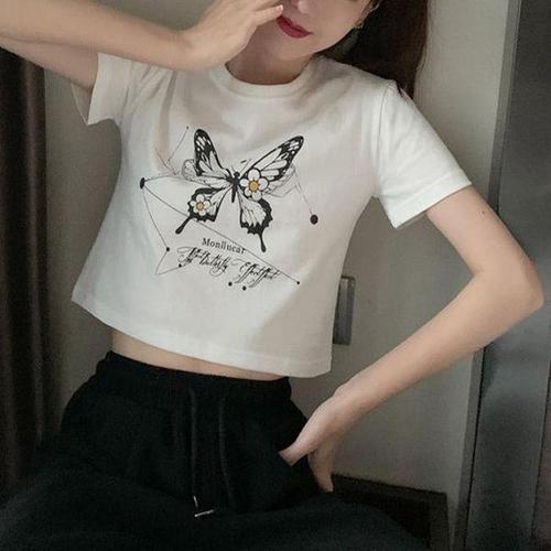 [셀러허브_여성트랜드패션]ONM 여성 데일리 여름 나비프린팅 크롭 반팔티셔츠