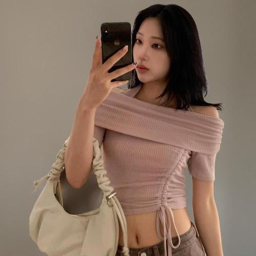 [신상오픈런]여성 오프숄더 크롭 니트 반팔티셔츠 셔링 골지 디자인