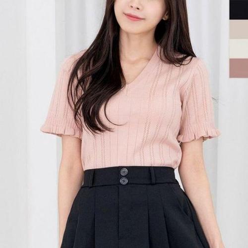 [에이치플러스몰]반팔니트 프릴 반팔티셔츠 크롭니트티 반팔 니트 브이