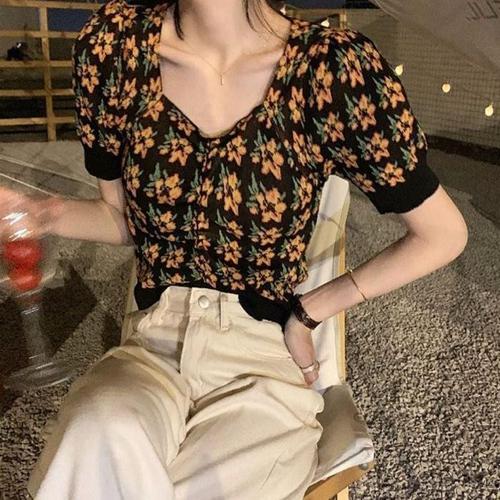 크롭니트 빈티지 브이넥 반팔티셔츠 어깨셔링 플라워