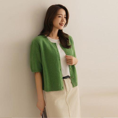 |KMJ6804|여성용 크롭 반팔 가디건 코튼 세로골지 라운드넥 단추 디자인