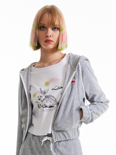 [키르시] 위티 버니 스플릿 그래픽 크롭 후드 집업 [멜란지 그레이]