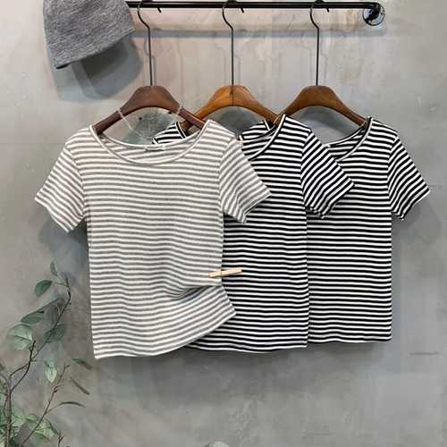 키야 스트라이프 세미 크롭 반팔 티셔츠 3color