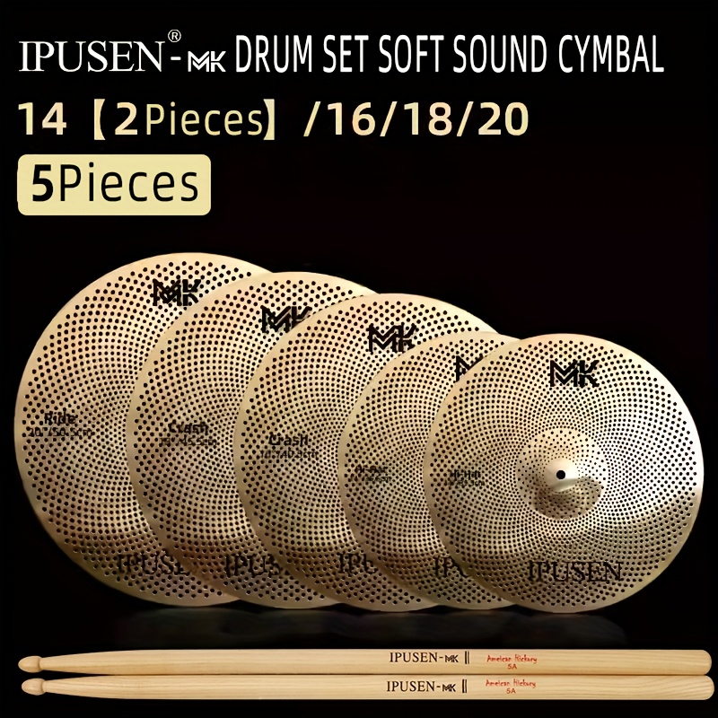 TEMU 저음 사이즈 심벌 세트 - 5개 무소음 심벌 (14" 하이햇 X2, 16" 크래쉬, 18" 파워 크래쉬, 20" 라이드), 하이커리 드럼 스틱 포함, 골드 및 실버 옵션