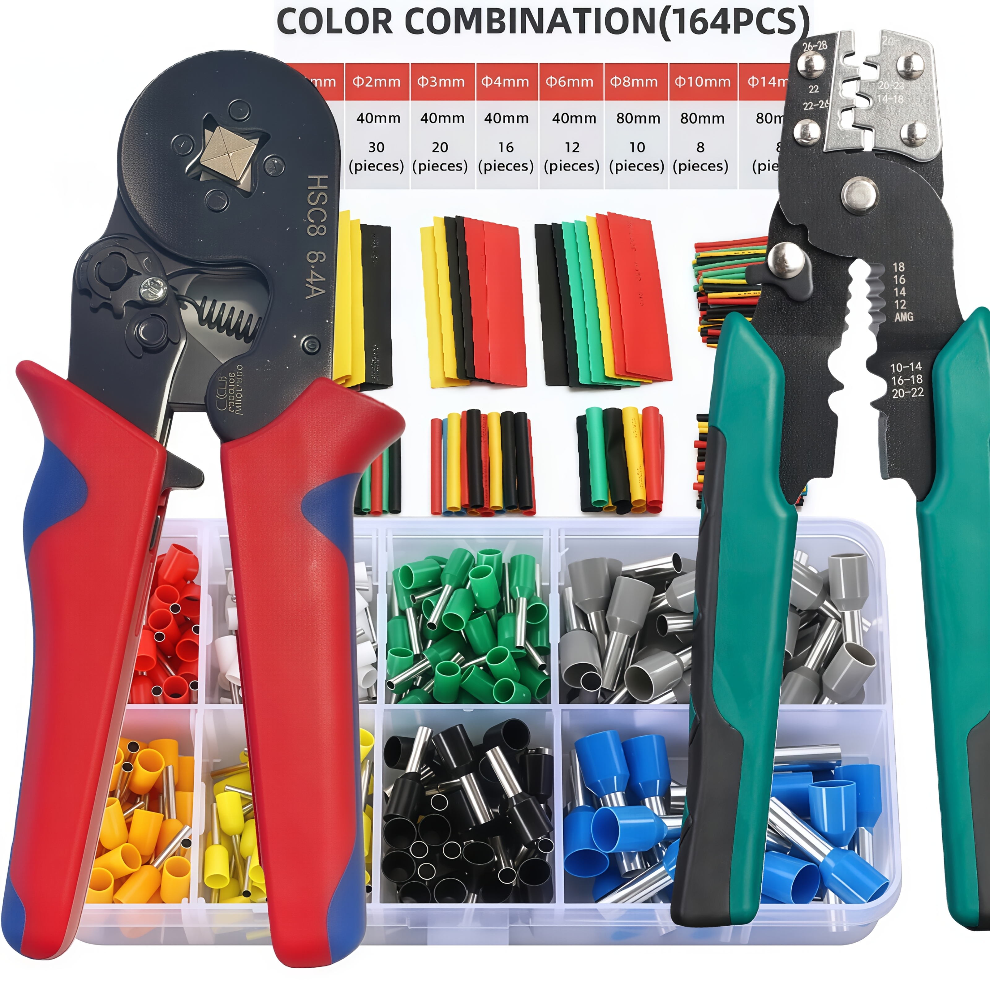 TEMU 와이어 압착 공구 세트 (와이어 스트리퍼, 압착 플라이어, 터미널 포함) + 164개 열수축 튜브, HSC8 6-4A AWG 23 압착 플라이어 + 멀티펑션 자동 와이어 스트리퍼 + VE 터미널 + 164개 열수축 튜브 | 헥스 커넥터 압착기, 내구성 있는 플라스틱 핸들 및 와이어 유지보수 클램프, 가정 및 전문 전기공사용