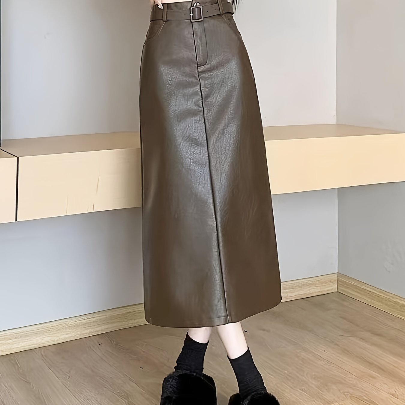 TEMU 캐주얼 솔리드 컬러 하이웨이스트 A라인 PU 여성 미디 스커트