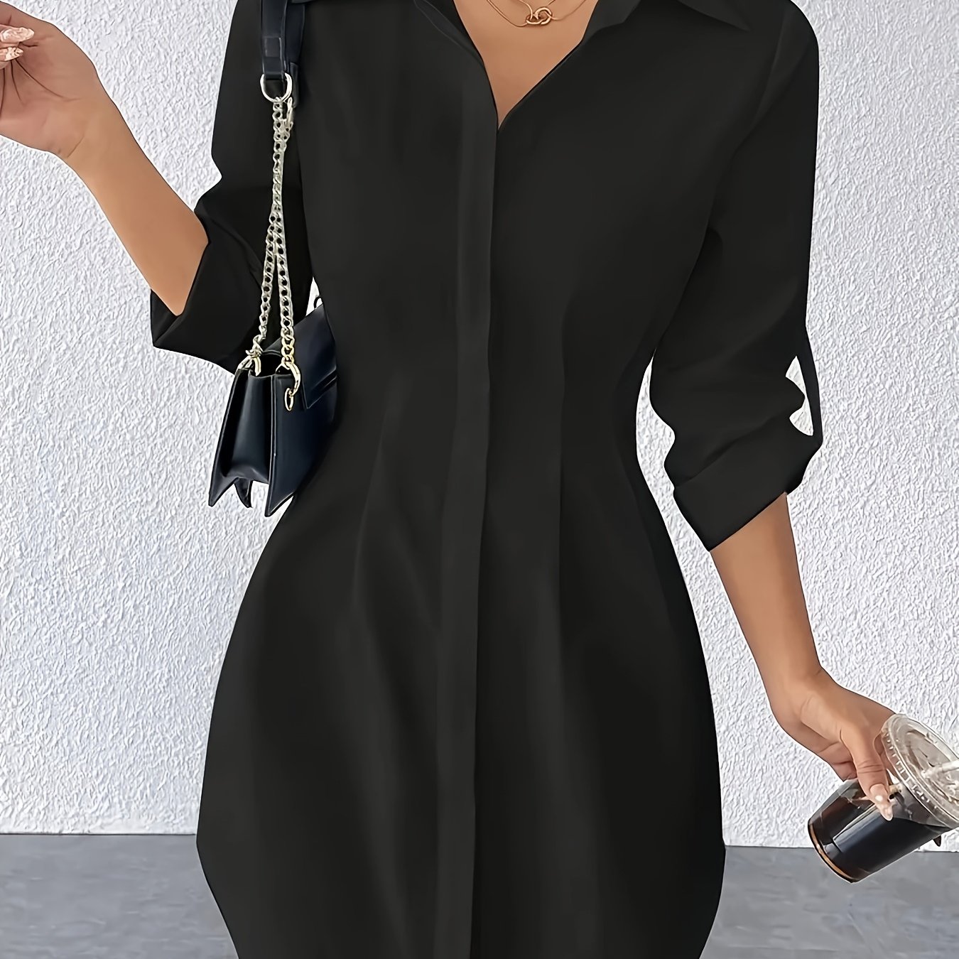 TEMU 여성용 우아한 셔츠 드레스 - 오피스부터 파티까지 포멀 & 세미포멀 착용, 기계세탁 가능 버튼 프론트 클로저, 구조적 논스트레치 원단으로 사계절 활용 가능한 프로페셔널 & 캐주얼 의류, 여성복, 다재다능한 워드로브 필수 아이템, 클래식 칼라 디자인, 내구성 있는 소재, 롱 슬리브 드레스, 직장인 여성을 위한