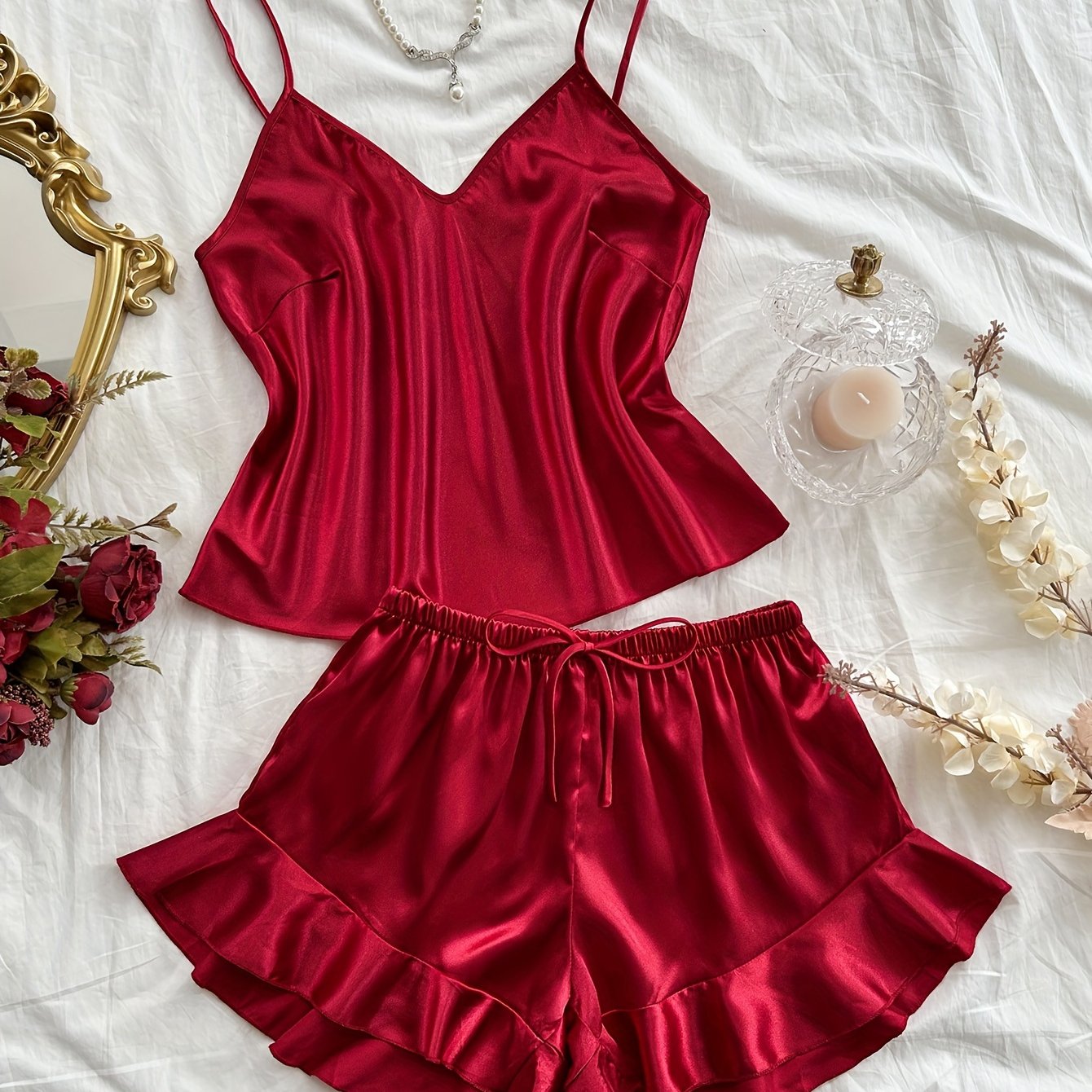 TEMU 여성용 핑크 사틴 두피자 세트 - 레이스 트림, 러치드 허리, V넥 탱크 탑 & 반바지, 올시즌 편안함, 로맨틱한 데이 디자인, 로맨틱한 의상|레이스 트림 반바지|무늬 없는 질감, 여성용 파자마