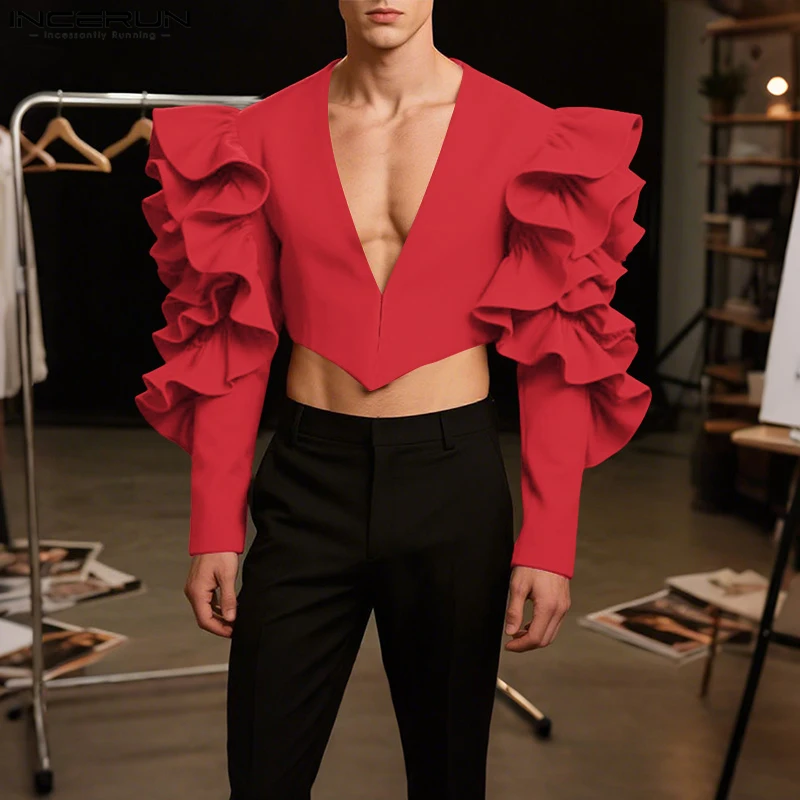 INCERUN 남성용 불규칙 블레이저 러플 솔리드 컬러 긴 소매 딥 V넥 크롭 수트 남성 스트리트웨어 2025 패션 캐주얼 남성 블레이저
