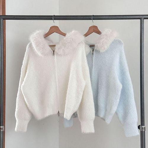 [옷자락]여성용 헤어리 후드 집업 가디건 투웨이 니트 자켓