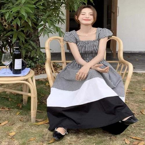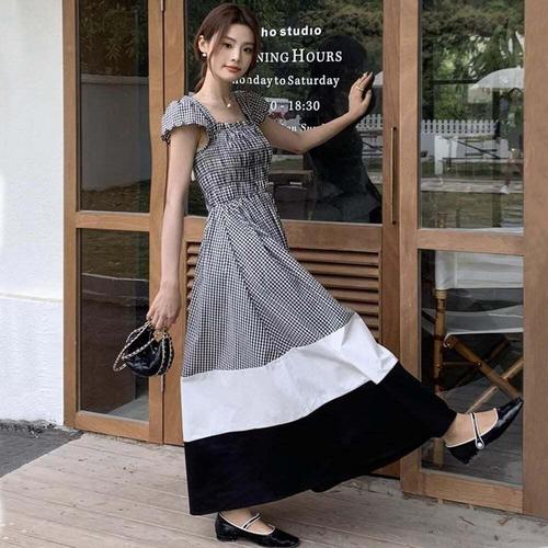 [셀럽하우스]여성 WIVB9725 체크패턴 배색 투톤 포인트 스모크밴딩 롱원피스