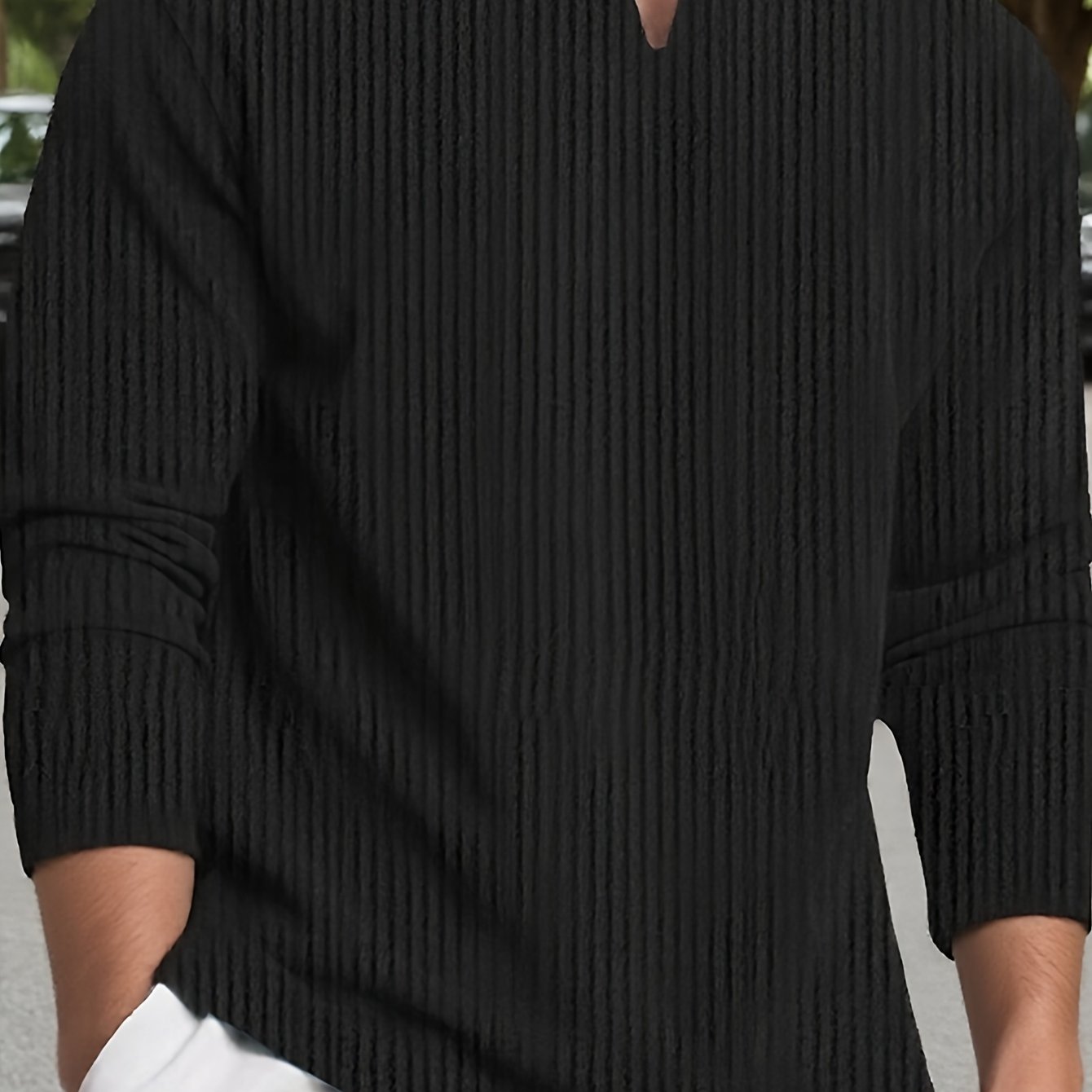 TEMU 남성용 티셔츠, 단색 니트 골지 질감, 작은 V넥, 긴소매, 봄/가을에 편안하고 캐주얼한 스타일.