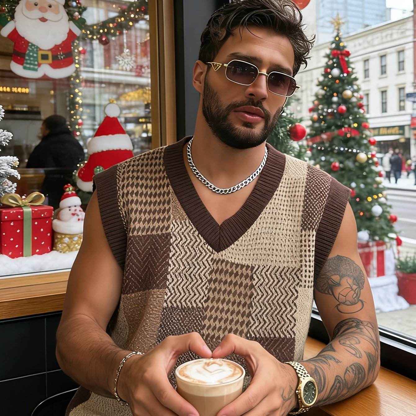 TEMU 남성용 캐주얼 니트 조끼, 컬러블록 디자인 및 V넥, 민소매 스웨터