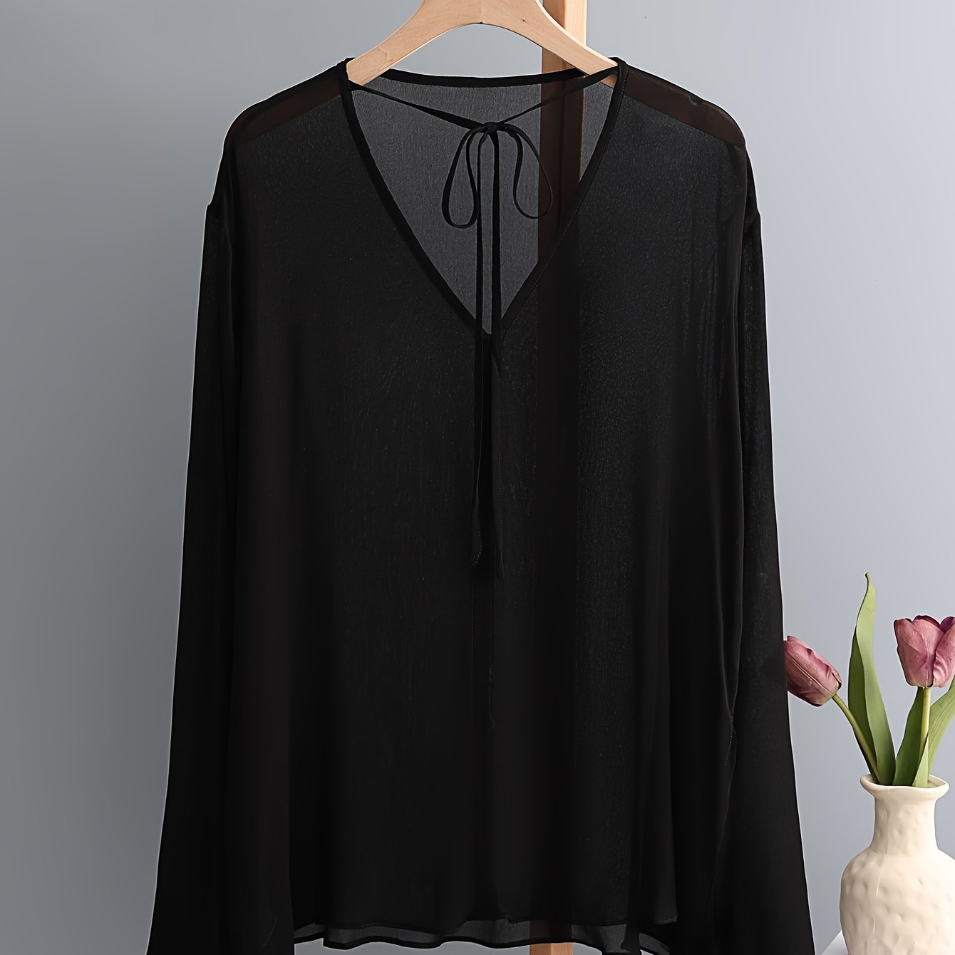 TEMU 캐주얼 가벼운 통기성 V넥 긴팔 재킷 - 반투명 100% 폴리에스터, 앞단면 짧은 뒷단 긴 밑단, 단색 봄 여름 가을용, 성인용 다용도 레이어링