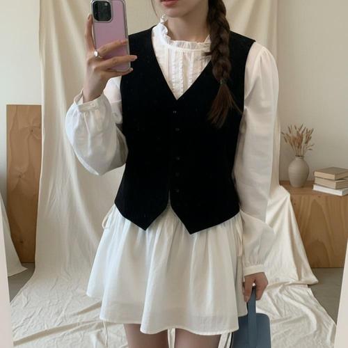 [르샵]리본넥 허리 스트링 미니 원피스형 블라우스 (BQ3BL006A)