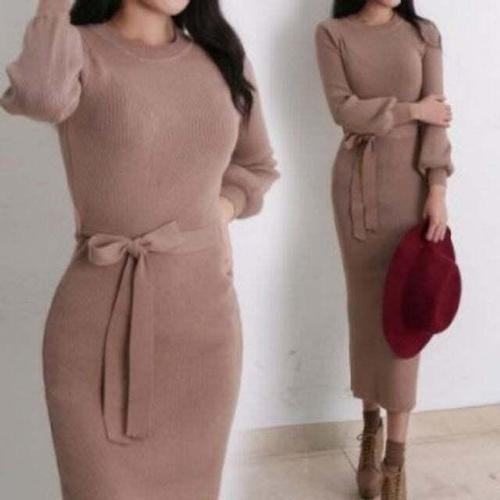 [셀럽하우스]여성 ZJVX9953 골지 롱원피스 허리스트랩 소매단추 옆트임