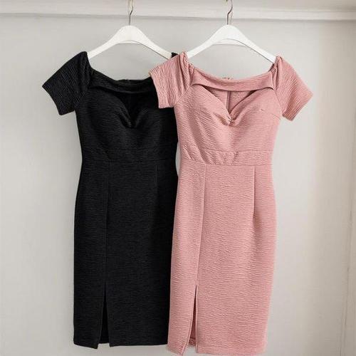 [신상오픈런]여성 셔링 하트넥 오프숄더 슬릿 슬림핏 반팔 드레스