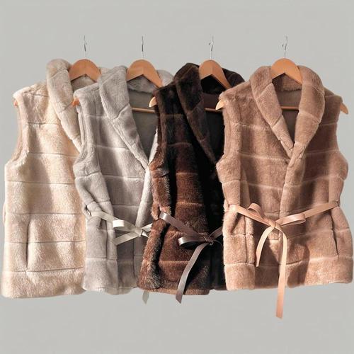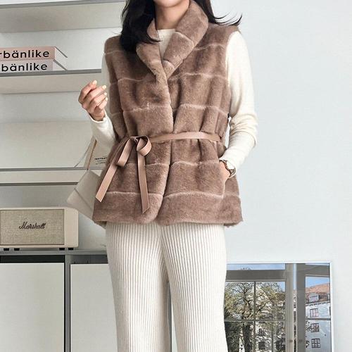 [미라클세븐]여성 파티 스타일 리본 허리끈 스트라이프 인조밍크 조끼
