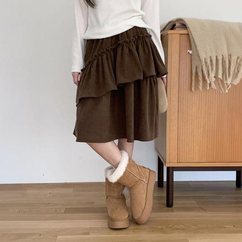 여성 언발 티어드 레이스 고무줄 골덴 스커트