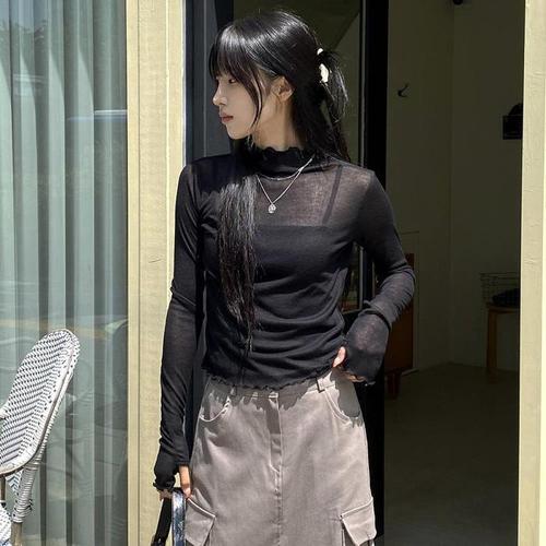 [다잇템]여자 핸드워머 포근 입술넥 스카시 슬림 티셔츠 (19158573A)