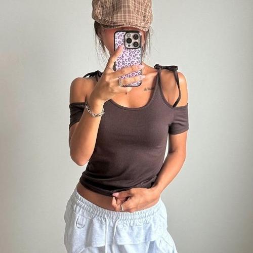 [1+1] [옷자락] 여자 워터밤 파랑색티 리본 어깨트임 슬림 크롭 나시