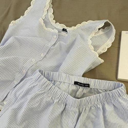 [옷자락] 여자 홈웨어 파스텔 단가라 나시 반바지 파자마 세트
