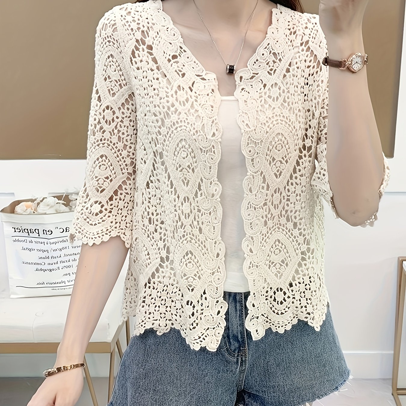 TEMU 레저 할로우 스타일 5슬리브 가디건