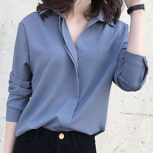 여자 카라넥 셔츠 짙은색 블라우스 간절기 가을 코디 (WB06434)