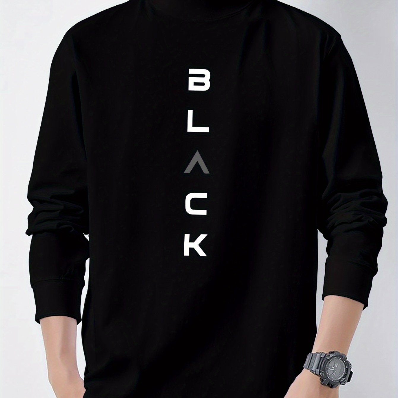 TEMU 남성용 블랙 하이넥 긴팔 티셔츠 "블랙" 그래픽 - 캐주얼 & 스타일리시, 중간 스트레치, 올 시즌 편안함, 일상 티셔츠 | 강력한 그래픽 티 | 편안한 핏