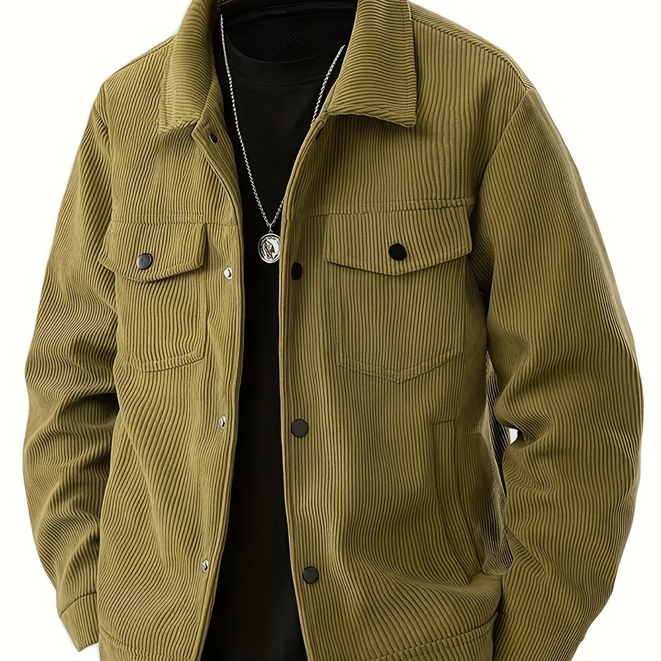 TEMU 남성용 올리브 그린 재킷 - 편안한 핏의 헤비듀티 버튼 프론트 코트, 가슴 포켓 & 칼라, 봄/가을 시즌에 다용도로 캐주얼하게 착용, 남성용 포근한 재킷, 남성용 우아한 빈티지 스타일 가을 재킷