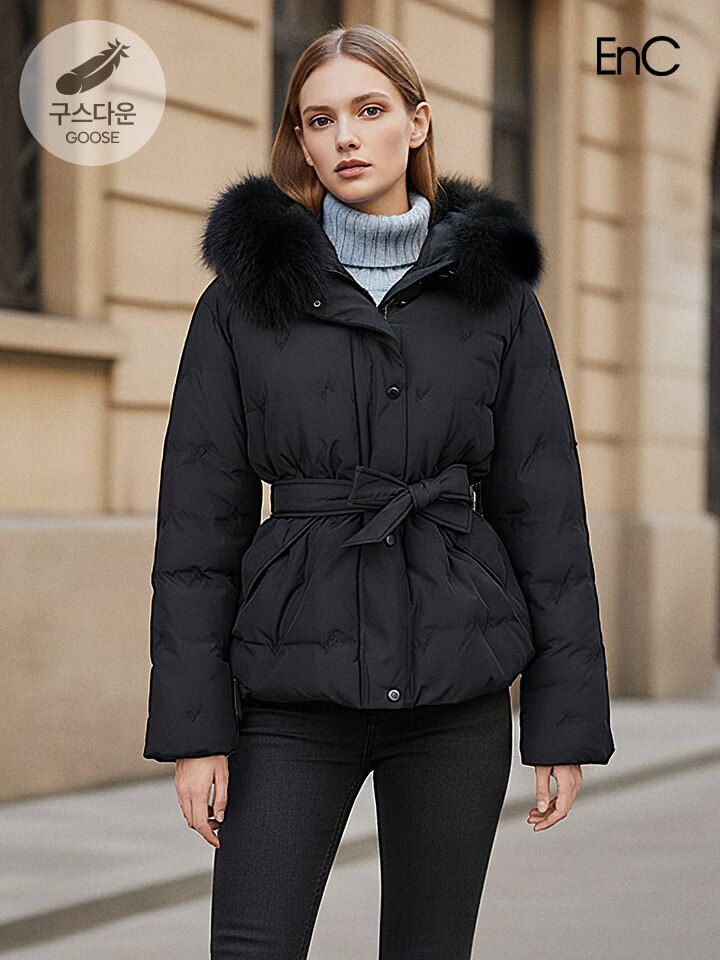 [패션플러스][이엔씨][ENC] 구스 자수패치 벨티드 폭스 후드패딩점퍼 (ENJD34T53A)