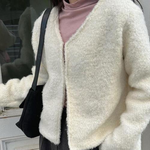 바이브모션 겨울 양털 퍼 브이넥 루즈핏 집업 가디건울가디건 롱가디건 니트 울가디건 가디건 퍼가디건