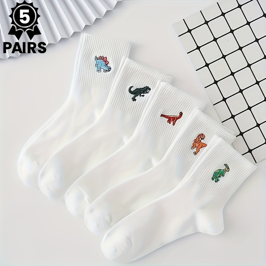TEMU 사계절용 스타일리시한 공룡 패턴 여성 중목 양말 5켤레