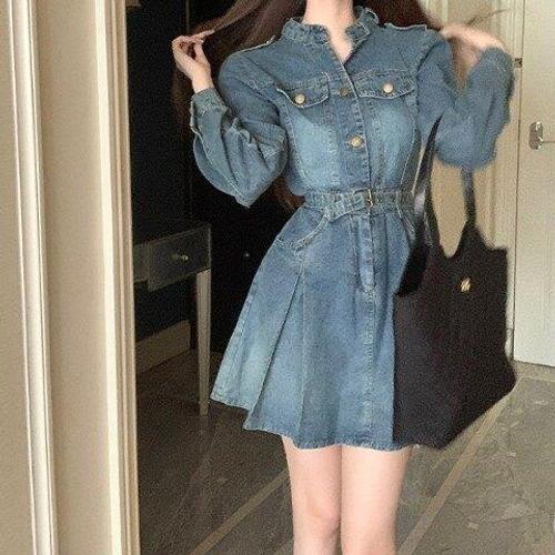 [다잇템]여자 데일리 카라 퍼프 데님 롱 원피스