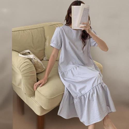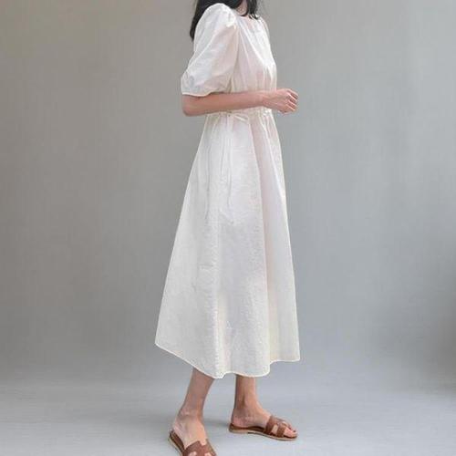 [신상오픈런]여성용 사랑스러운 무지 코튼 퍼프 소매 플레어 롱 드레스