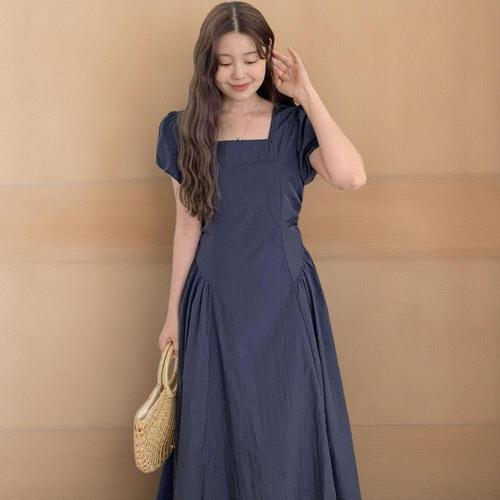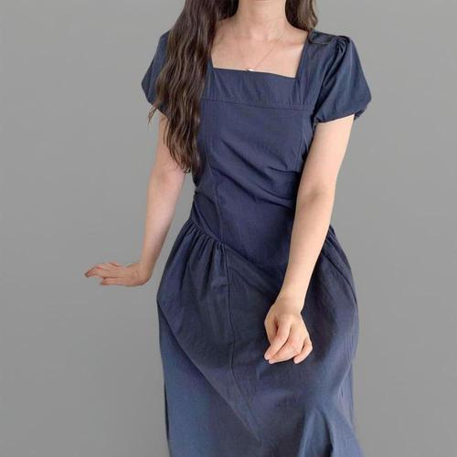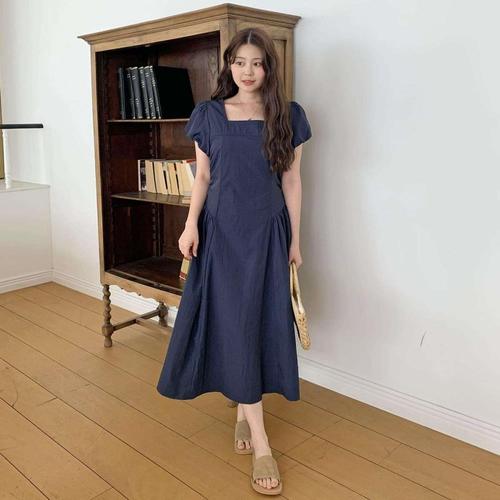 |CHO5667|여성 바스락 스퀘어넥 핀턱 셔링 퍼프 롱 드레스