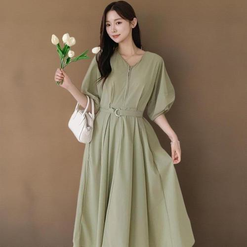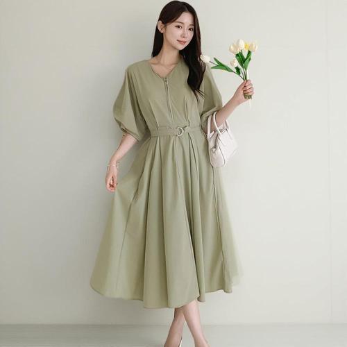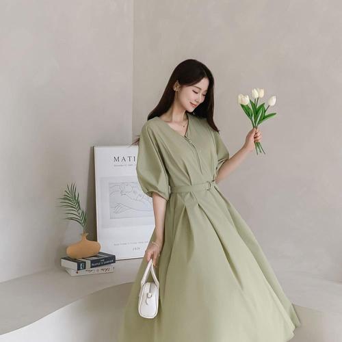 |CSO5620|여성 여름 하객 드레스 반집업 브이넥 퍼프 소매 롱 원피스