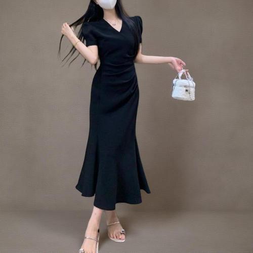 [신상오픈런]여성 블랙 퍼프소매 롱 원피스 브이넥 머메이드 드레스