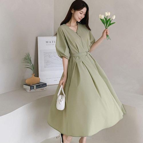 |CDO562F|여성용 브이넥 퍼프 소매 벨트 플레어 롱 드레스