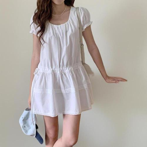 [신상오픈런]여성 화이트 퍼프 소매 셔링 여유핏 미디 드레스