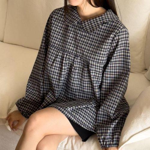 [옷자락] 여자 가을 빅사이즈 셔링 카라넥 퍼프 체크 블라우스