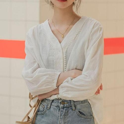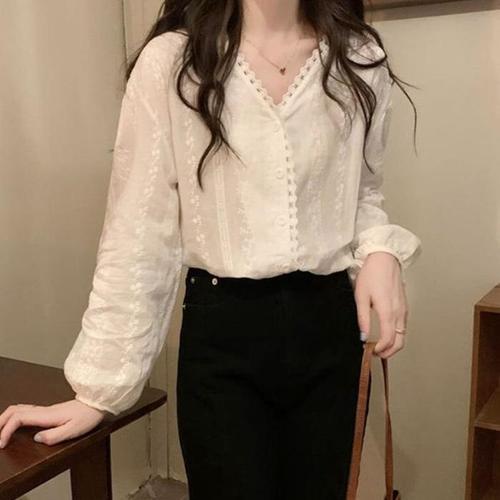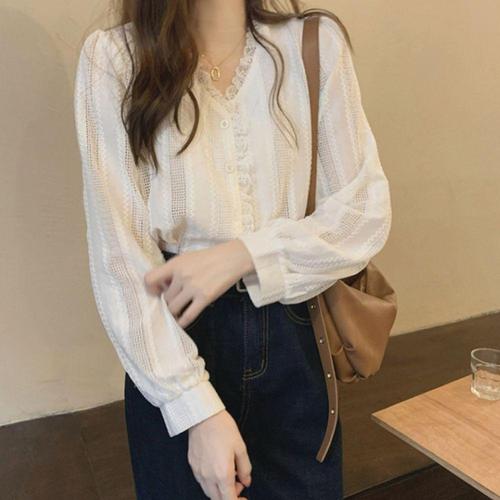 [다잇템]여자 흰색 펀칭 롱슬리브 레이스 V넥 블라우스 (41005995A)
