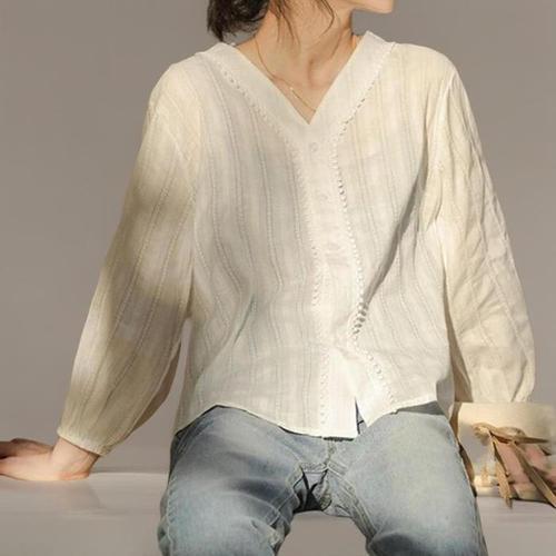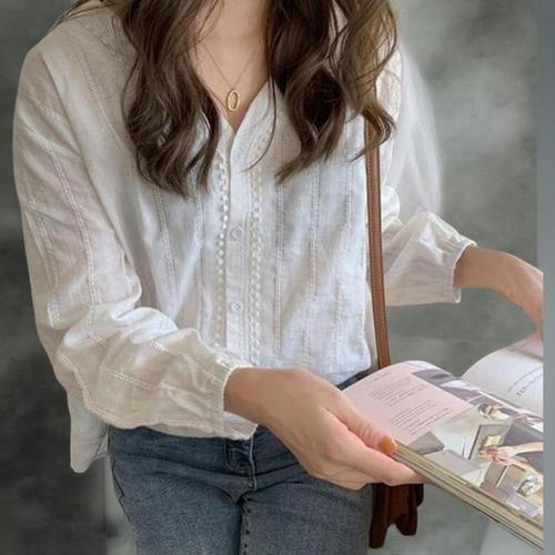 [다잇템]여성 레이스 펀칭 롱슬리브 흰색 V넥 블라우스 (41040801A)