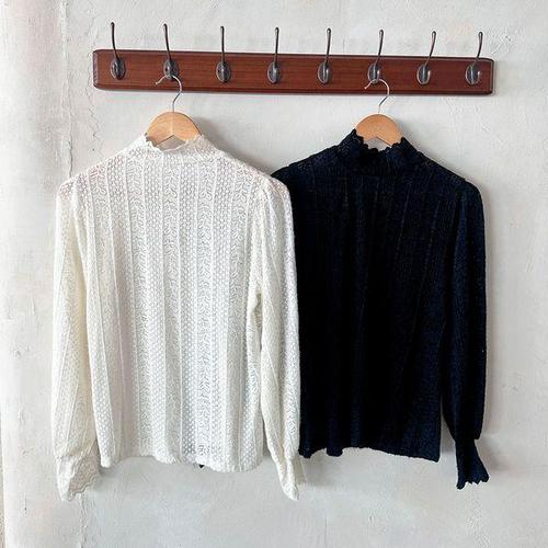 [옷자락]여자 펀칭 레이스 물결 폴라넥 봄하객룩 퍼프 블라우스