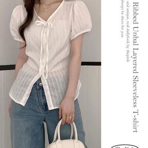 더핑크 / 한비 펀칭 스트링 백 스트랩 콩단추 반팔 블라우스