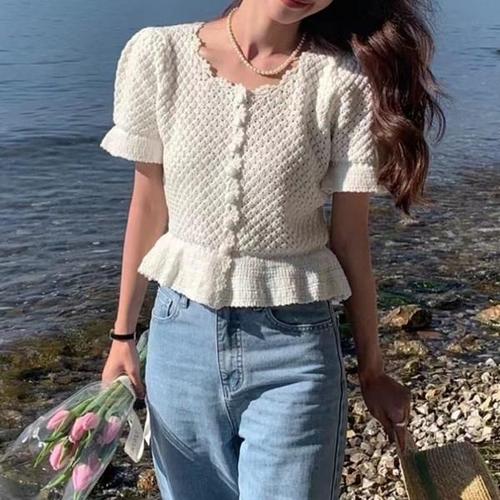 [신상오픈런]여성 짜임 펀칭 퍼프소매 반팔 크롭 가디건