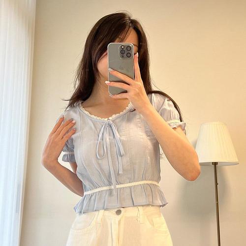 옷자락 / 여성 시스루 벌룬 소매 리본 장식 페플럼 블라우스