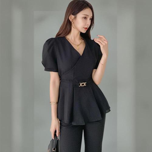[다잇템_패션]여성 리본 펌킨 장식 페플럼 소매 블라우스