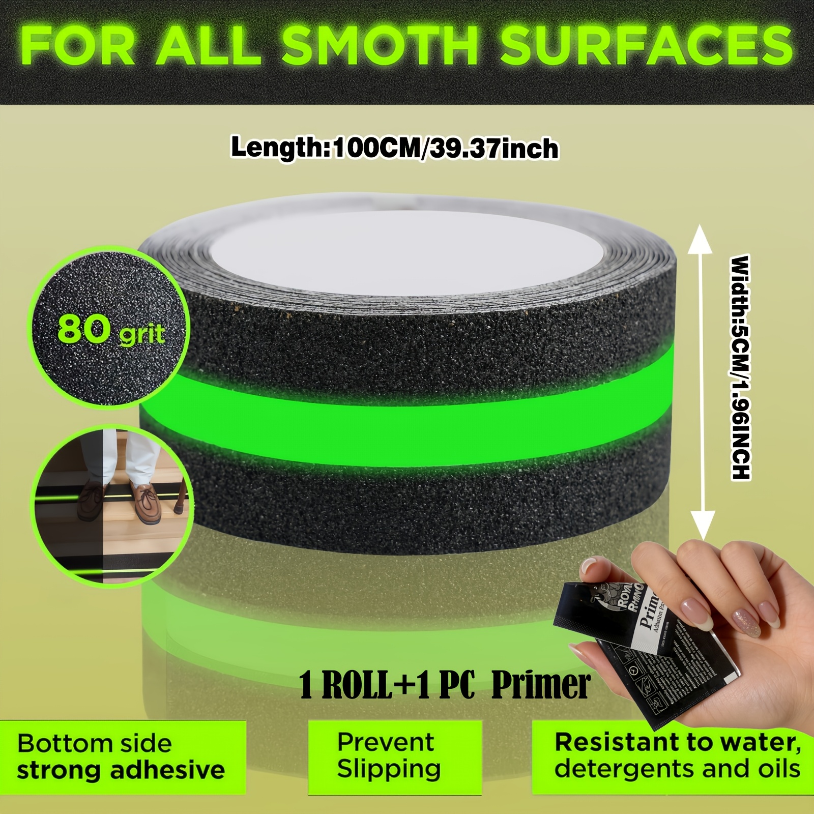 TEMU 야광 미끄럼 방지 테이프 1롤 - 야광 기술, 계단, 발판 및 바닥에 적합한 밝은 녹색 - 실내/실외 안전 테이프 (폭 1.96인치) - 가정, 사무실, 창고, 병원, 학교에 이상적 - 미끄럼 방지 디자인